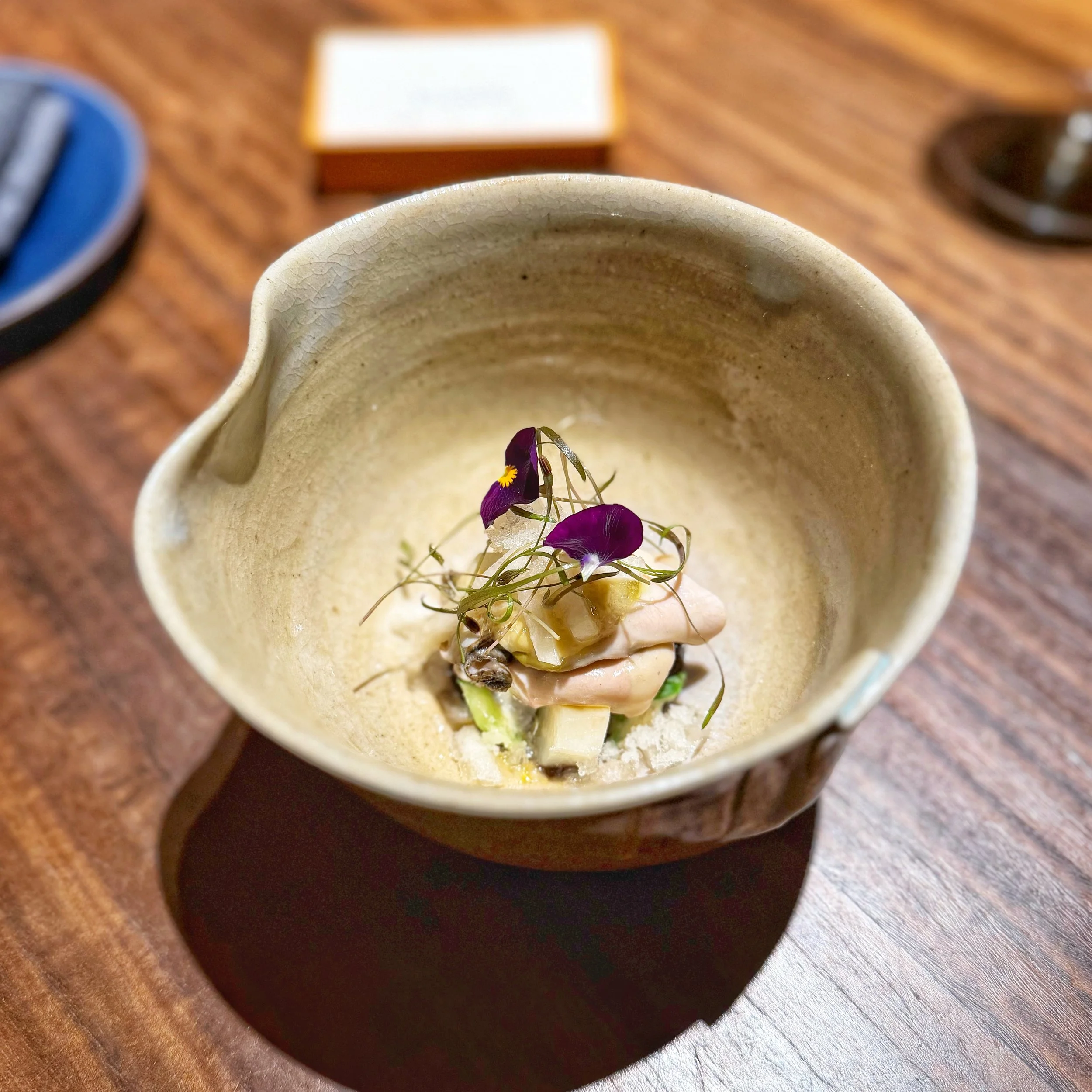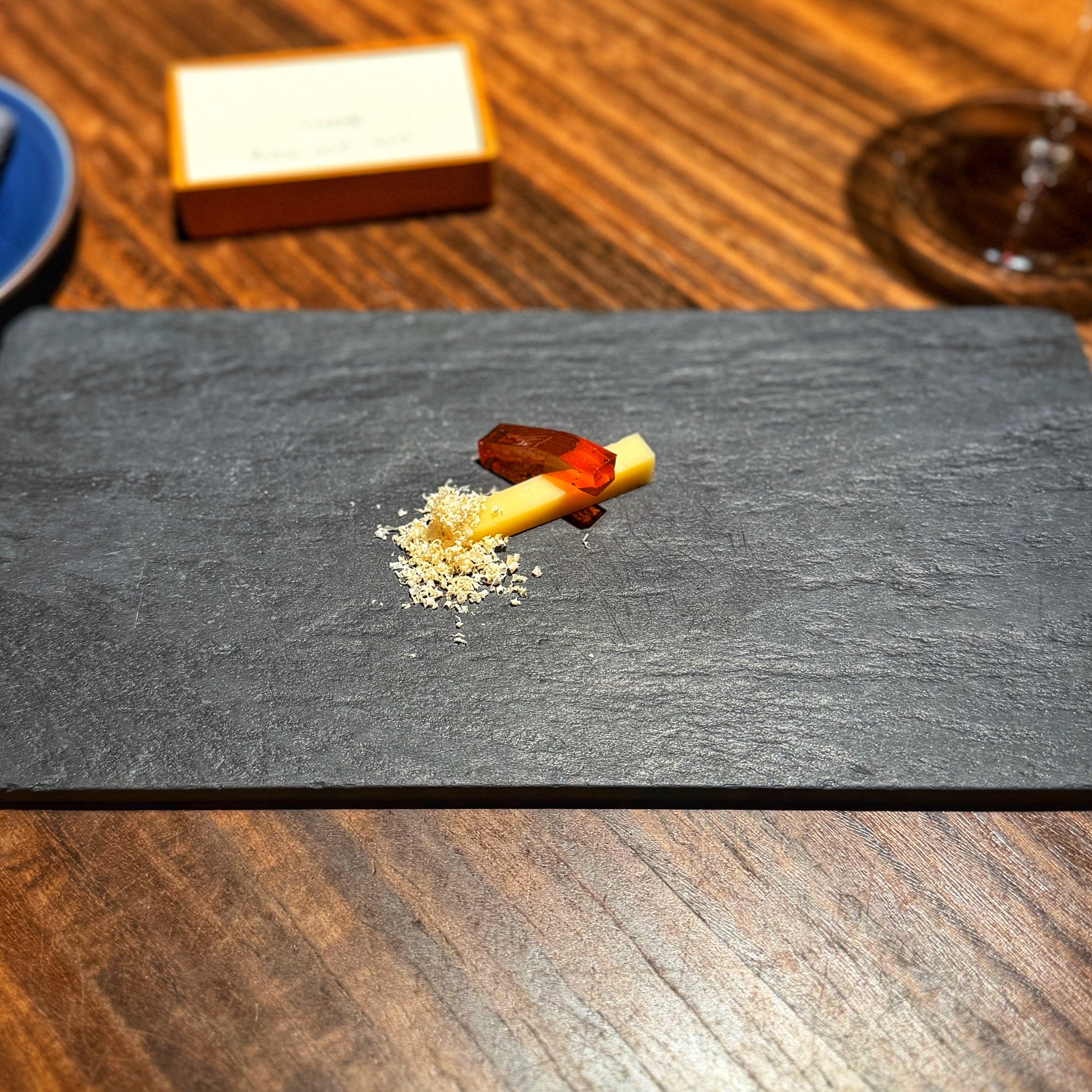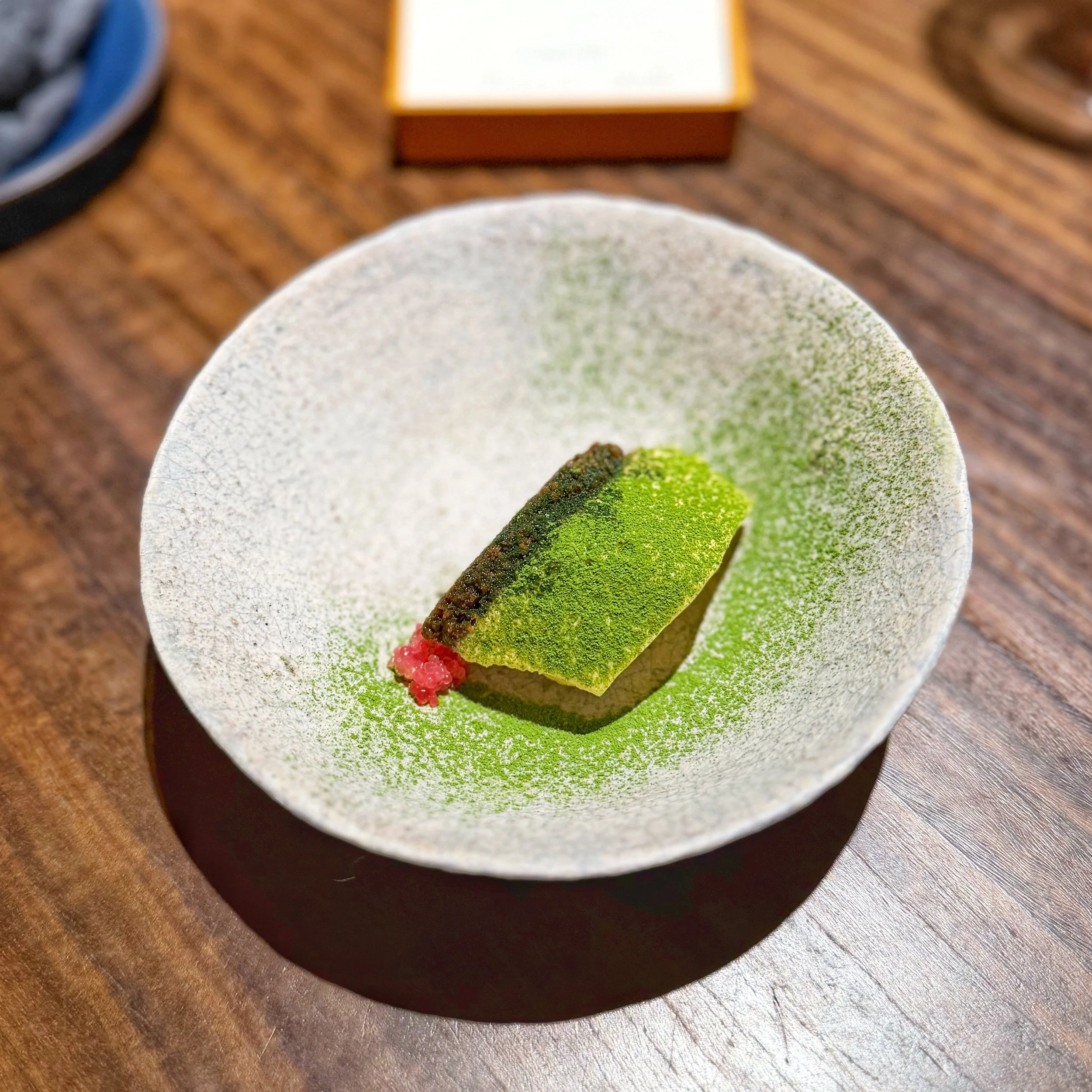 5. 白子のポチャール 生ハムのベール 柿の葉ほうじ茶とシェリー // Baked milt with persimmon leaves tea