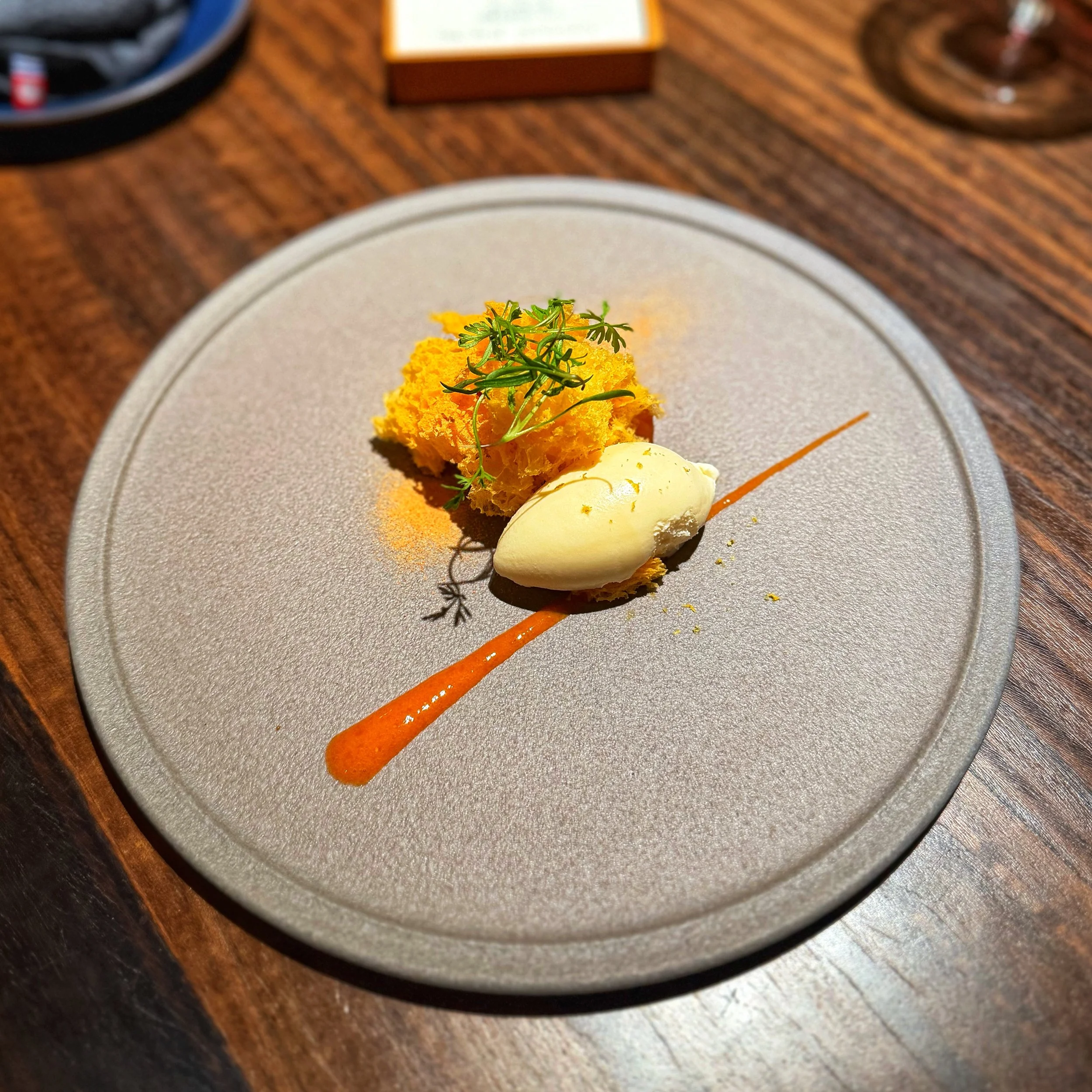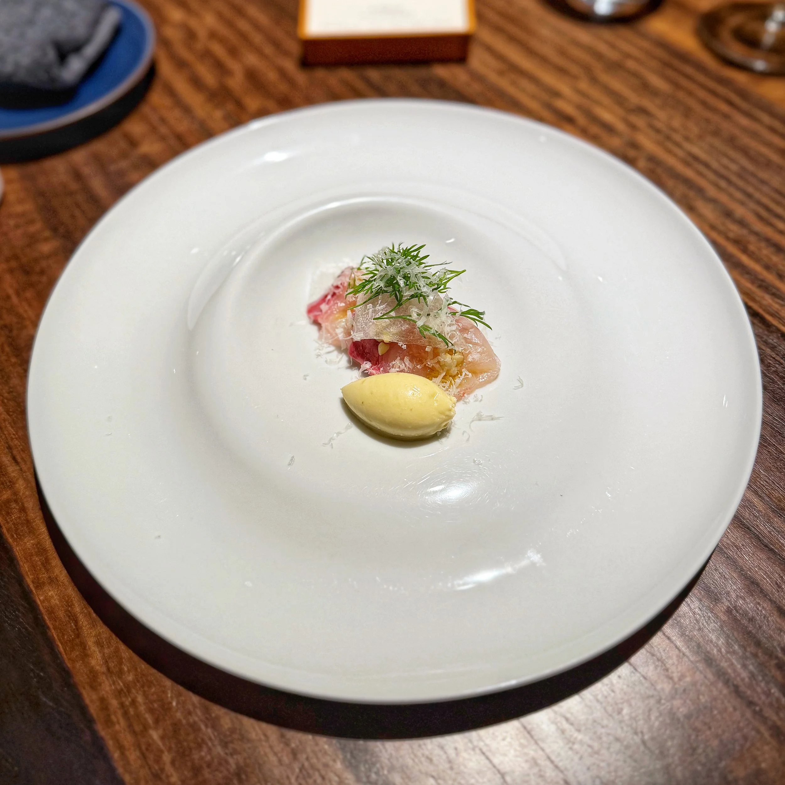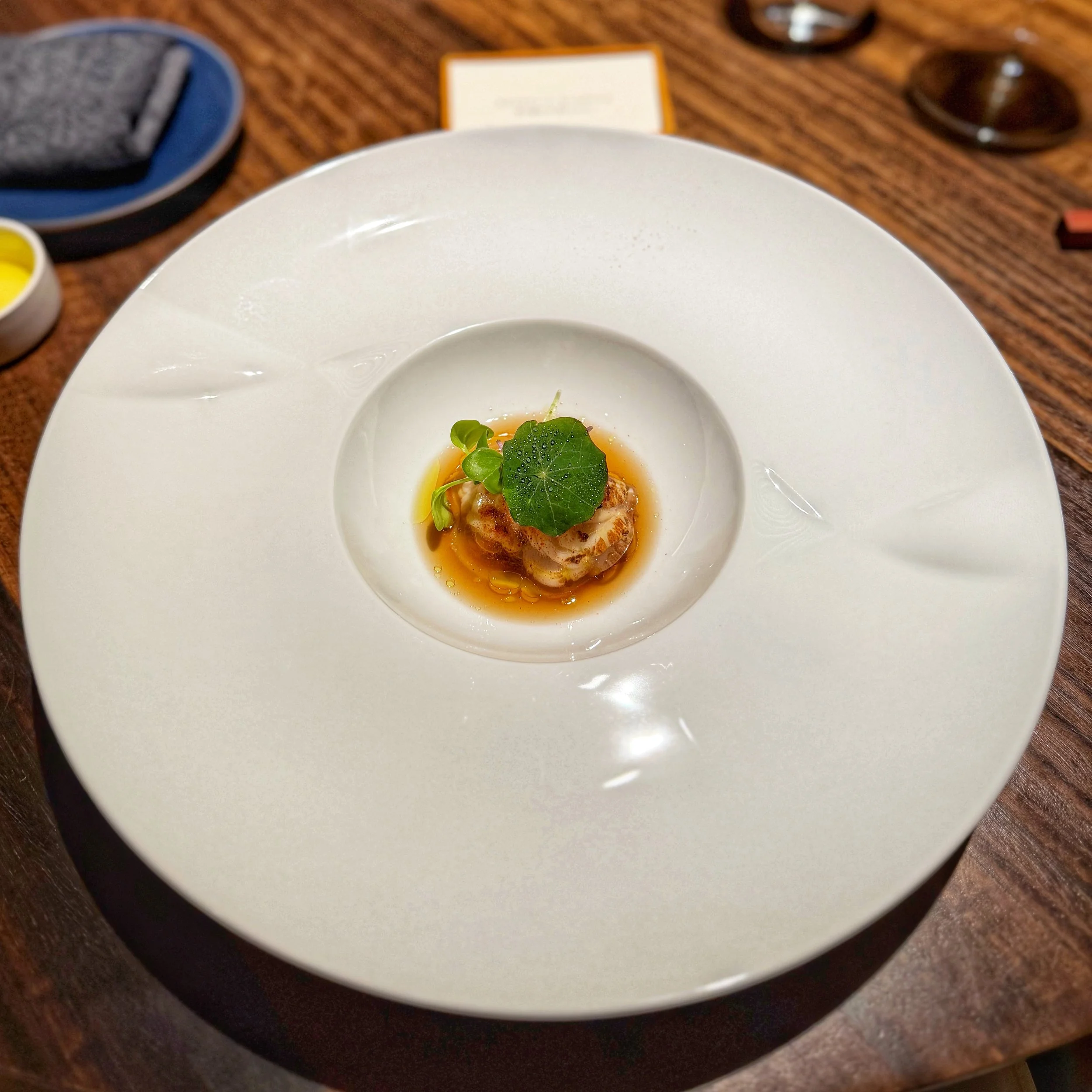 5. 白子のポチャール 生ハムのベール 柿の葉ほうじ茶とシェリー // Baked milt with persimmon leaves tea
