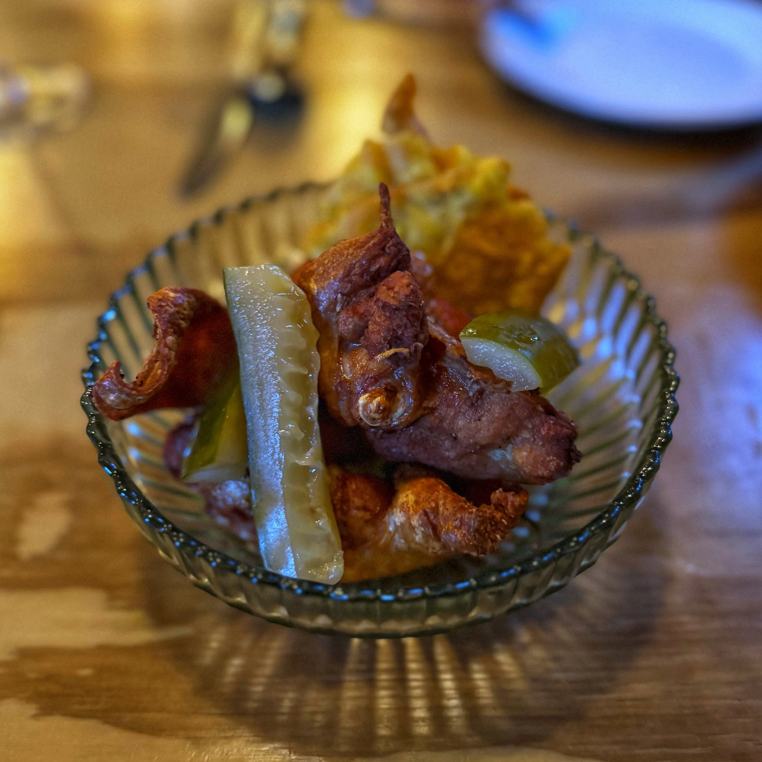 - 11. Chicken thigh chicharrones, 'Chiqui’s adobo', pickled cucumbers, tostones
