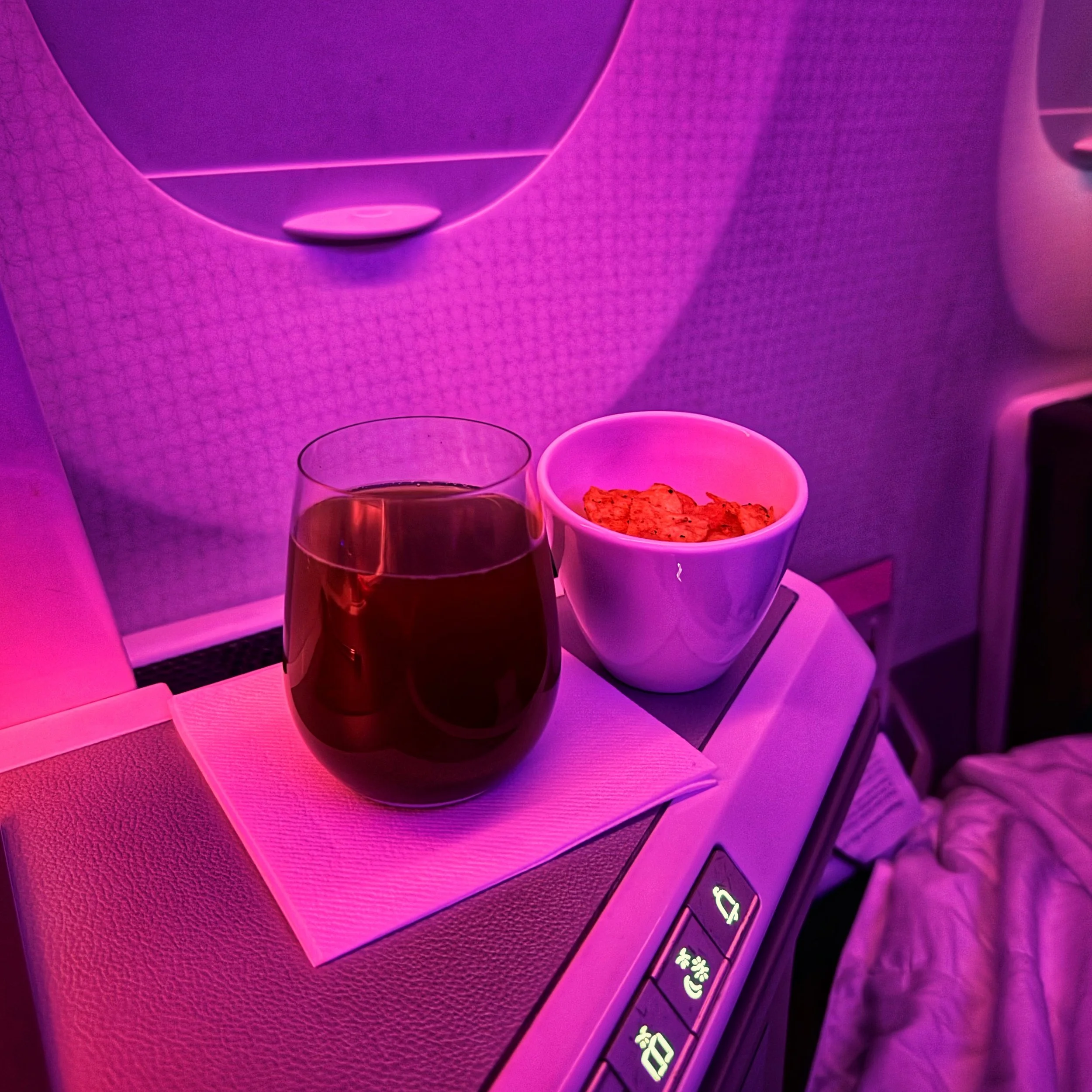 The Upper Class experience on VS138 from JFK to LHR, where maximizing sleep was the goal. But, first, sparkling wine and a mocktail. #broslondonporto #summereuroholiday25