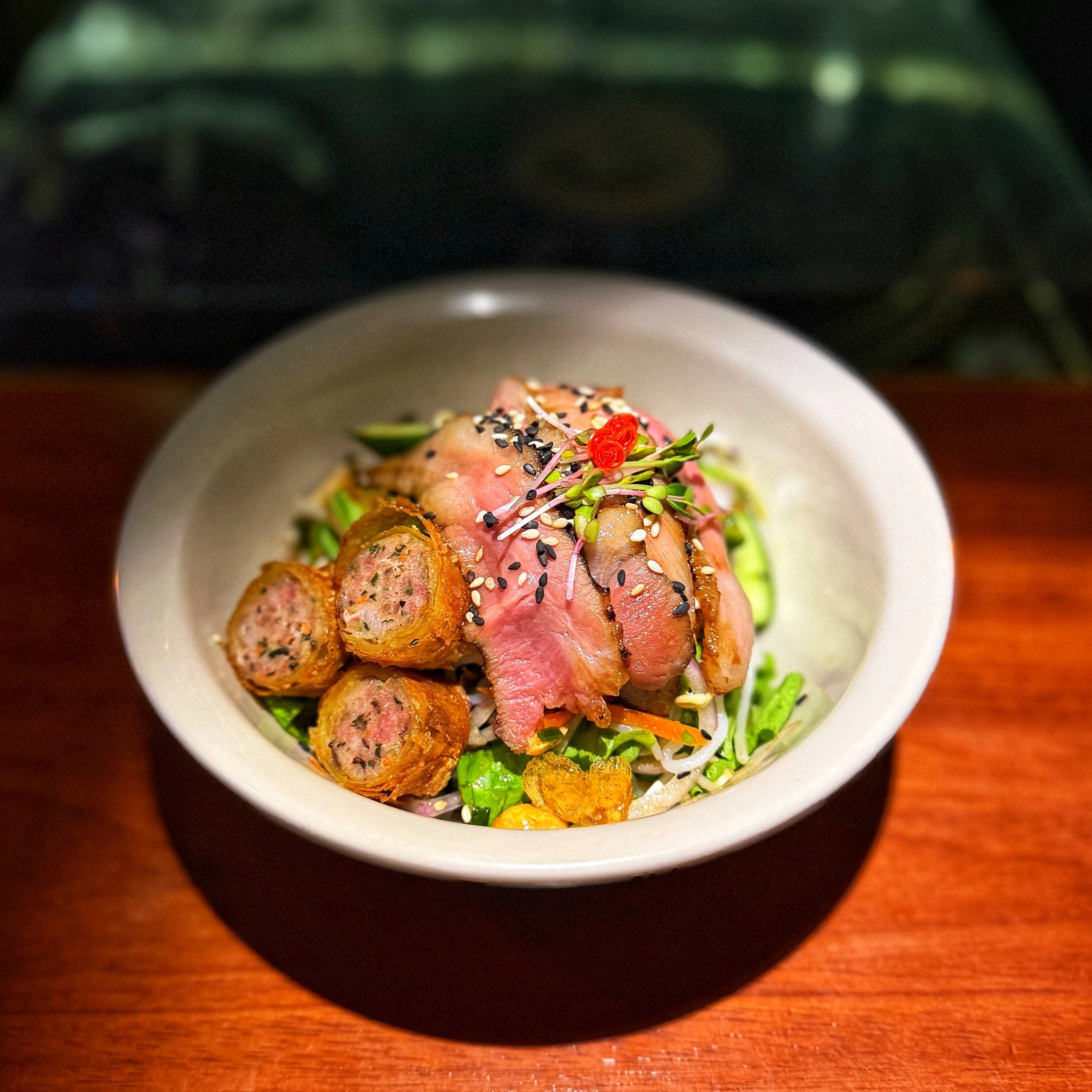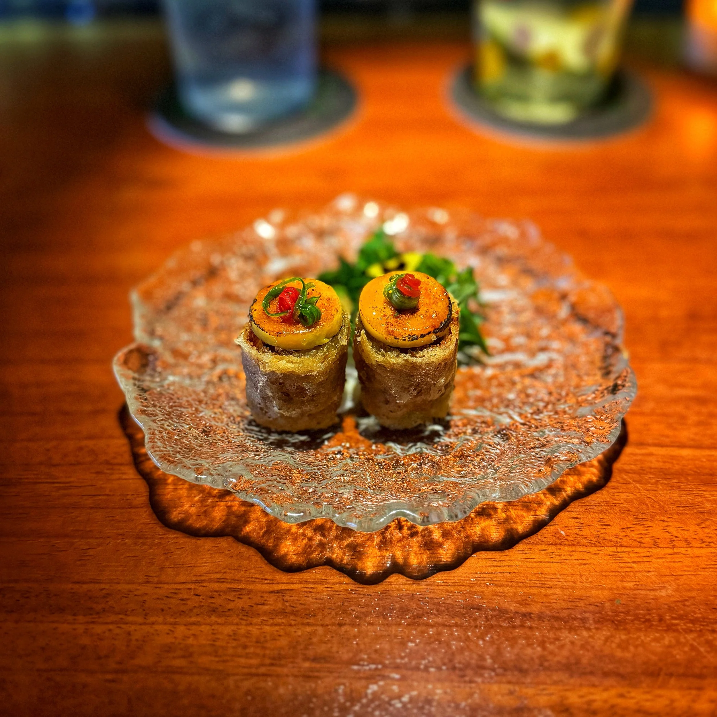 1. FOIE GRAS SPRING ROLL Foie gras, pork, herbs, mango brulee