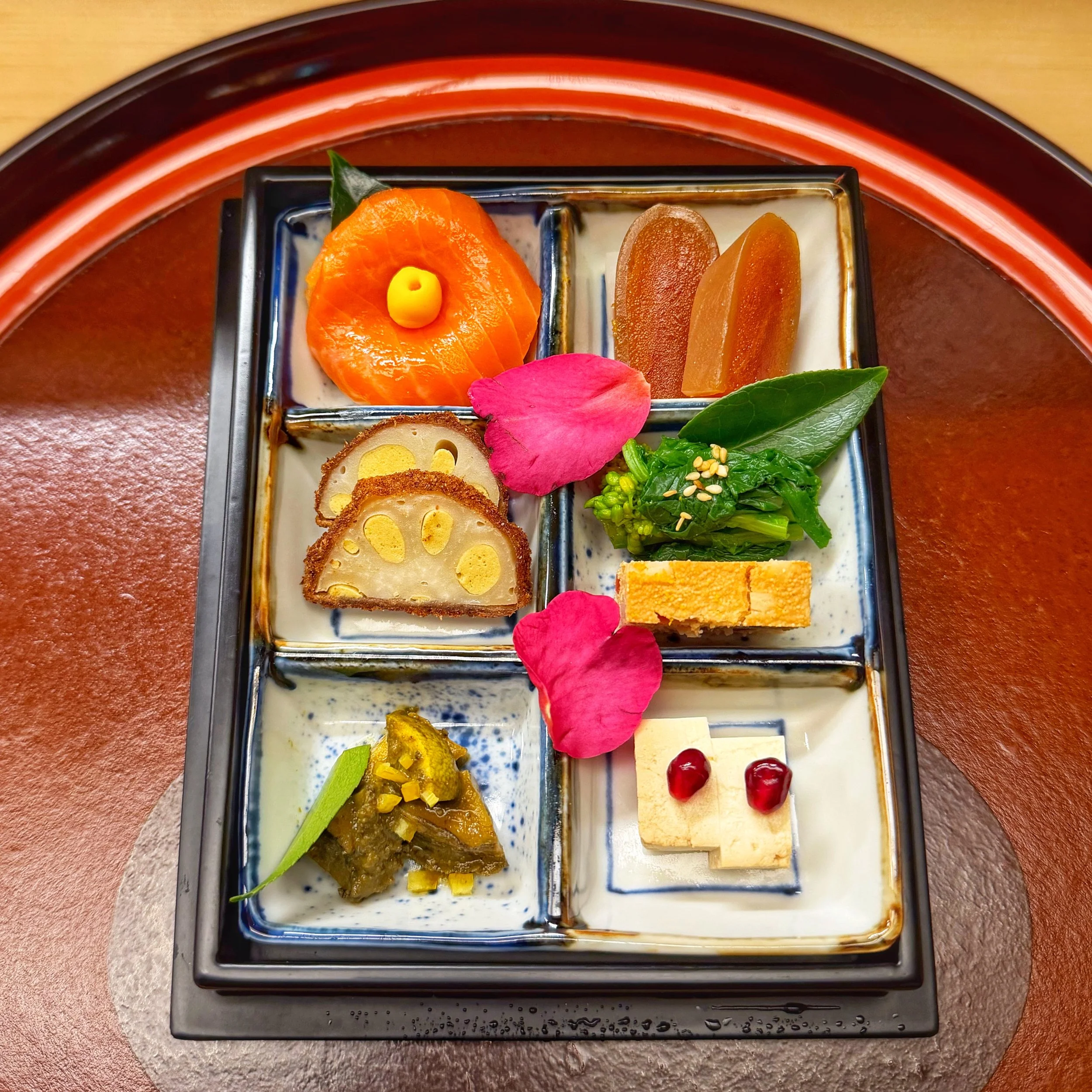 4. Hassun Assortment of appetizers: smoked salmon sushi looks like a camellia flower, mustard-dressed rapeseed, dried mullet roe wrapped in squid pickled in sake less, mustard filled lotus root, walleye pollock roe terrine, tofu marinated in miso, abalone with marinade lever sauce