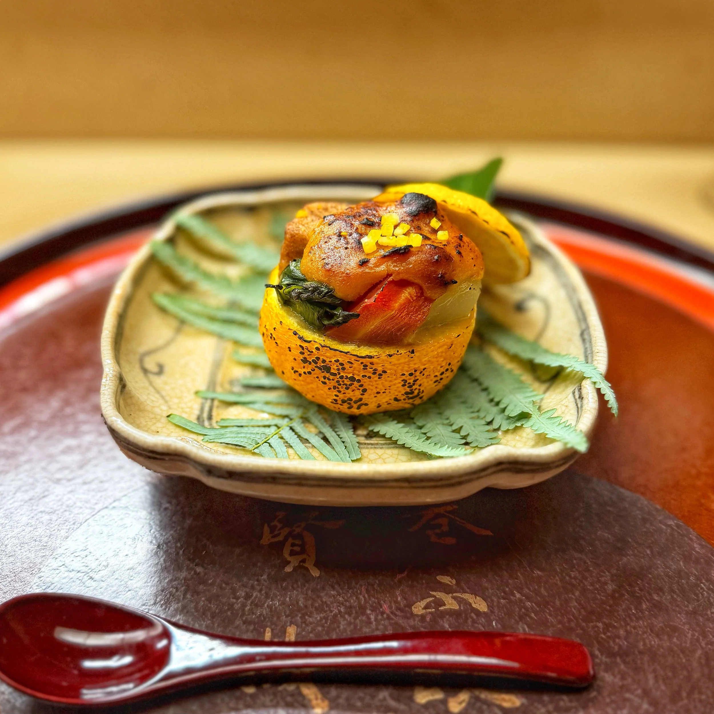 7. Yakimono Grilled dish with Yuzu: fried millet wheat, carrot, green onion, turnip, taro, yuzu miso