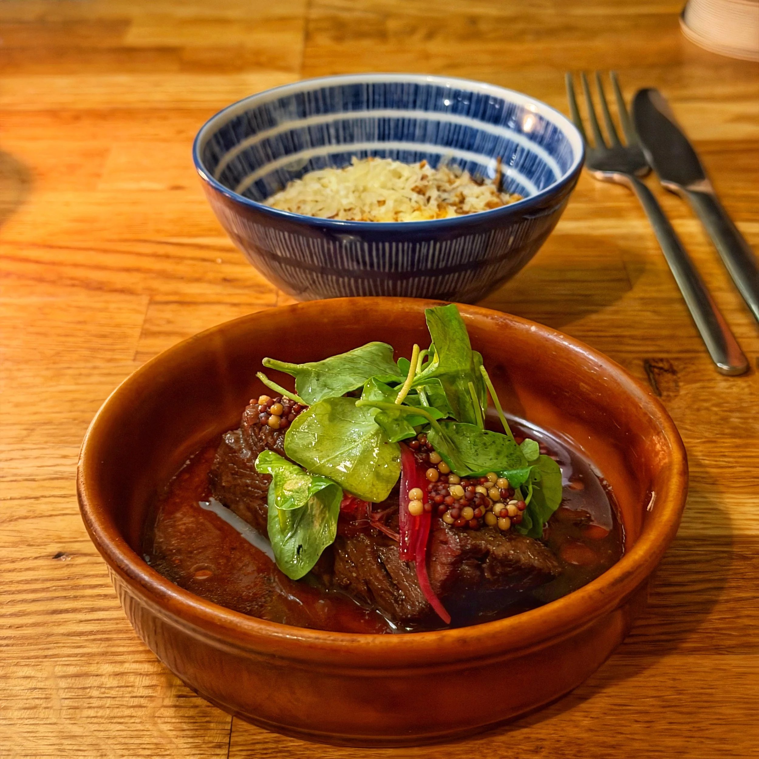 5. Glazed Hereford beef cheek with mustard, pickled red onion and landcress