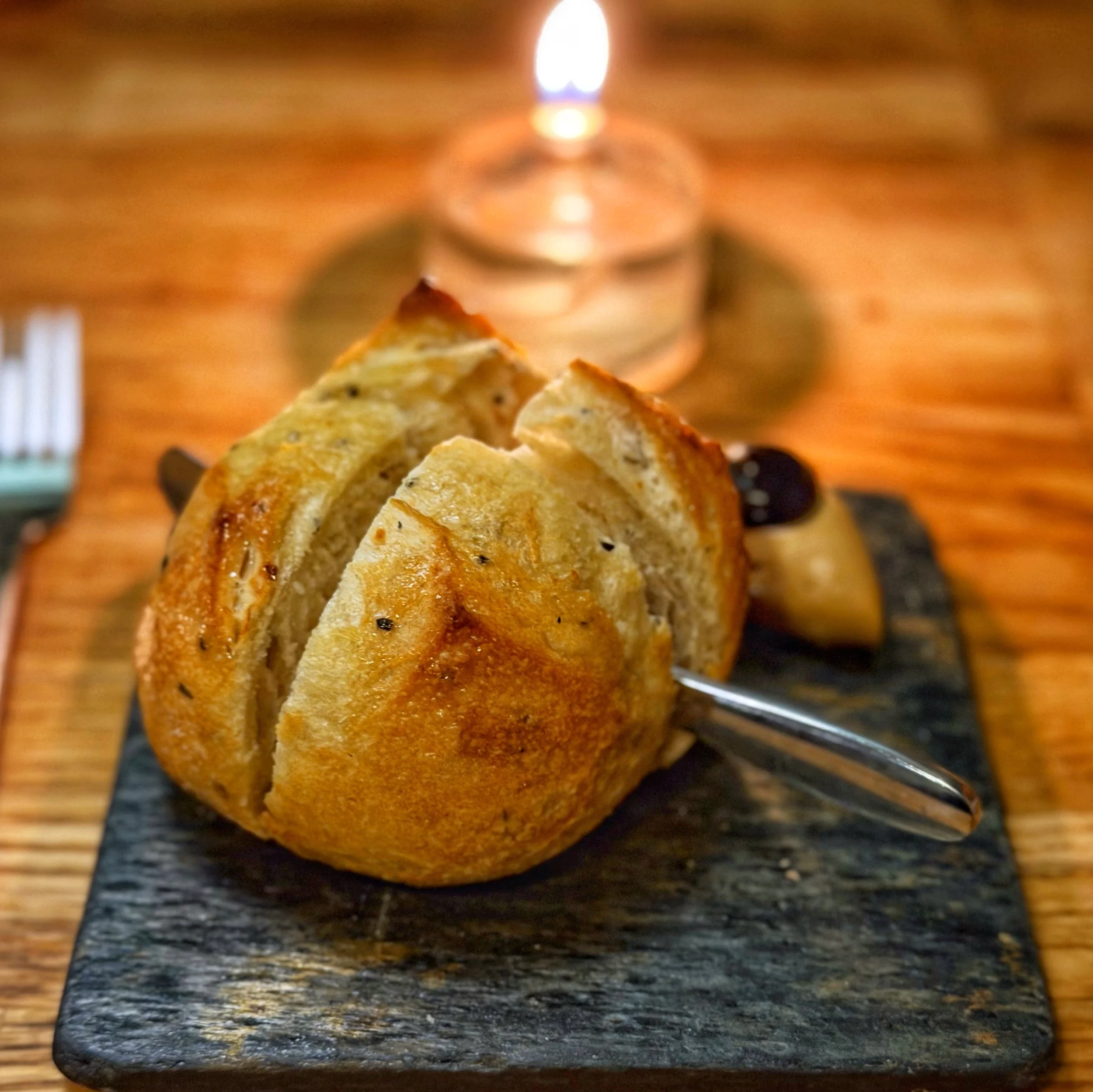 1. Potato and thyme sourdough with Bovril butter and pickled walnut