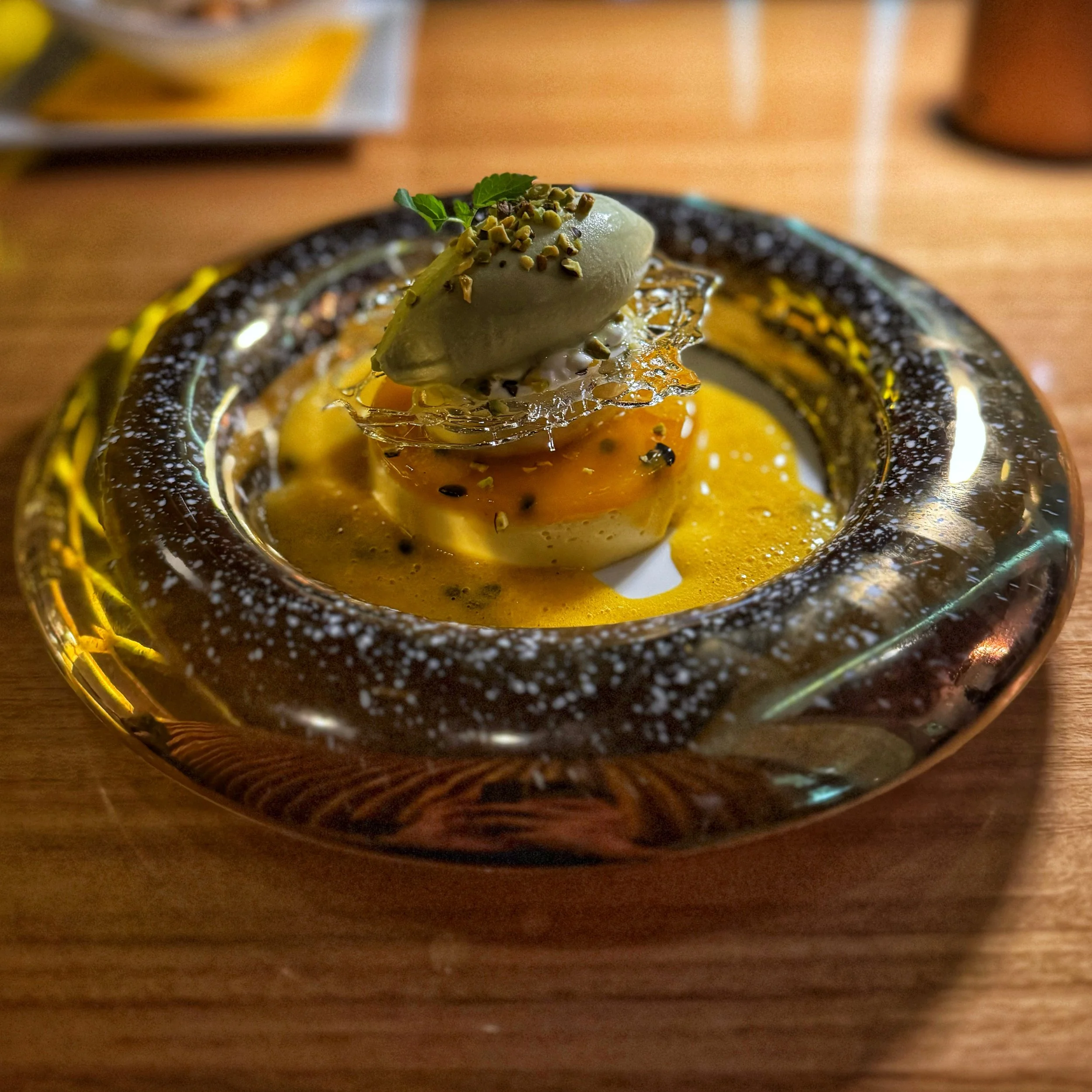 5. Local Passion Fruit Trilogy Bavarian crème, soft passion jelly and fresh pulp resting beneath a light Greek yogurt cake & Sicilian pistachio ice-cream