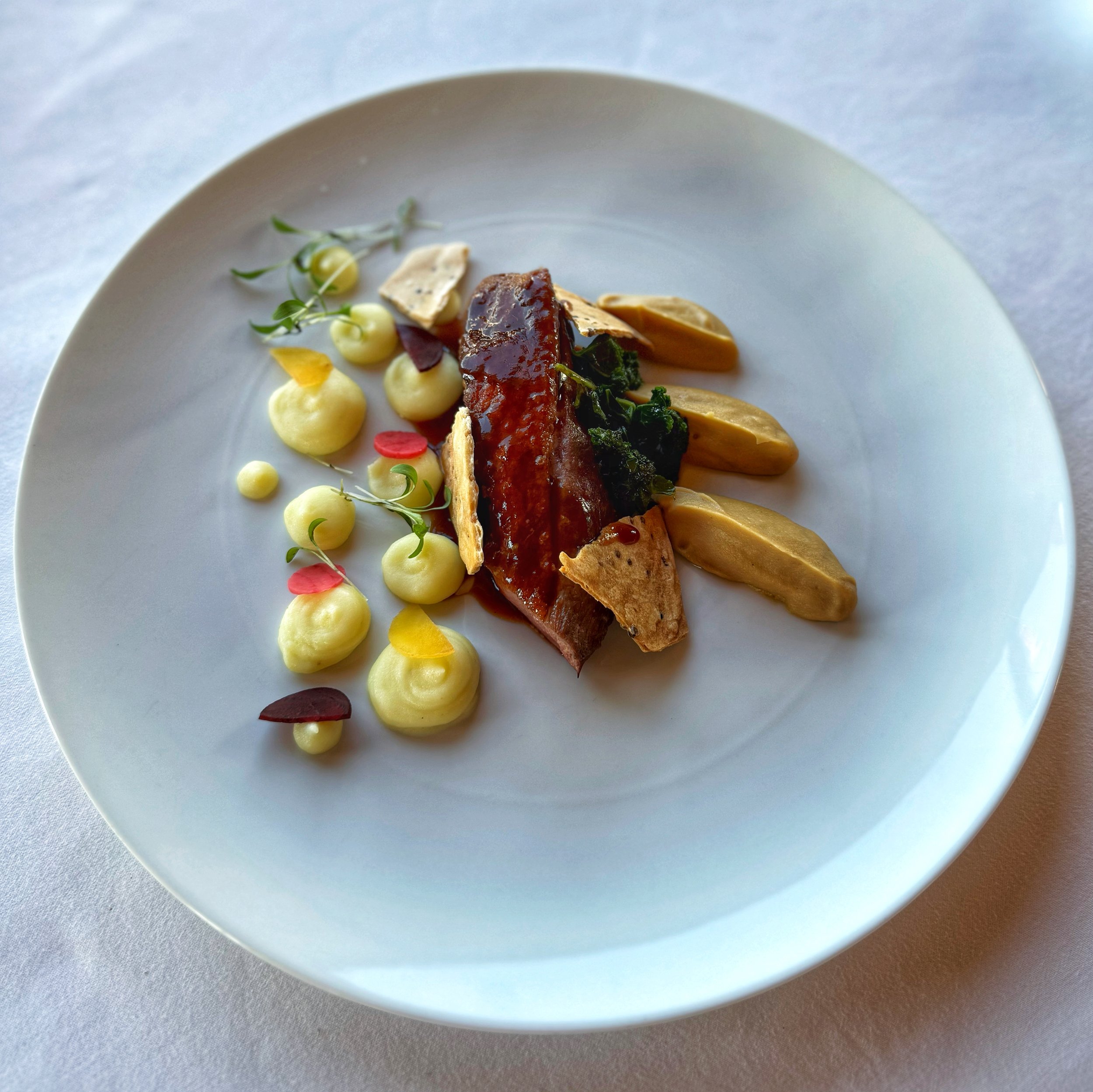 5. DUCK. Breast, creamy beet and potato purée & beetroot, kale, mustard crisps, pickled beets, hibiscus jus with raspberries